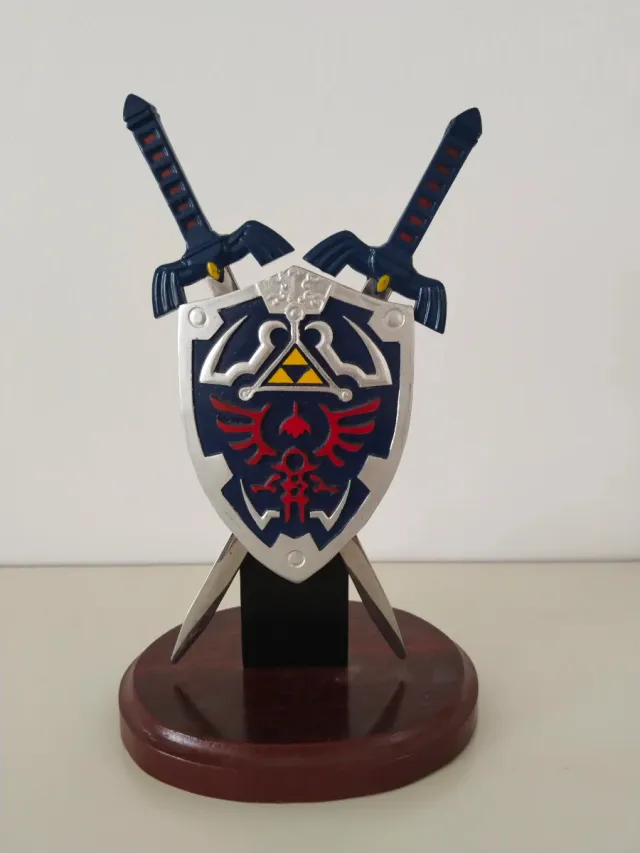 Réplica decorativa de la espada y el escudo de The Legend of Zelda.Espada maestro Hyliano con escudo, en miniatura, con soporte, regalo para fans de LOZ, coleccionistas y adultos
