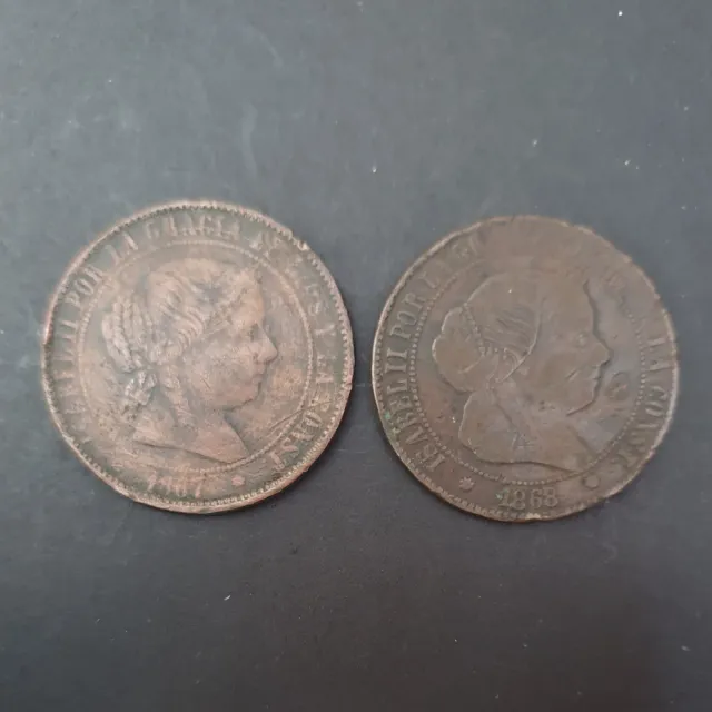 2 monedas de 5 céntimos de escudo: 1867, 1868. Isabel II. Ceca de Barcelona. Aleación cobre.