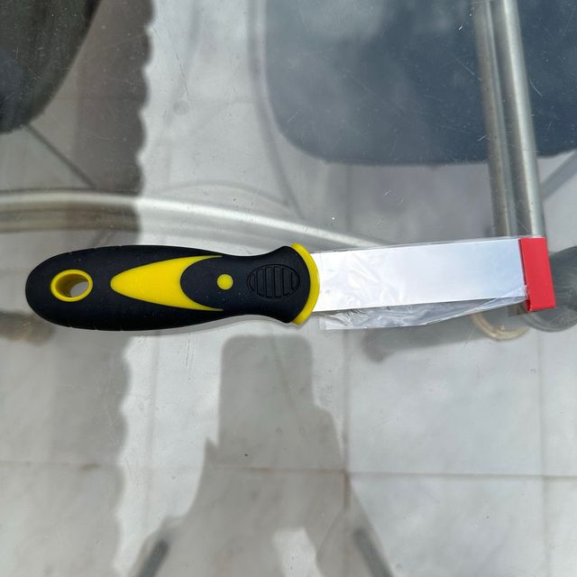 Espátula con un diseño de mango ergonómico para mayor comodidad. - Mango de goma negra y amarilla. - Hoja de metal plateada. - Punta de protección roja.