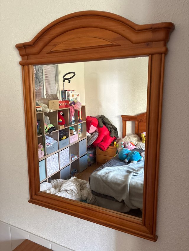 Este espejo de madera tiene un diseño clásico y elegante, perfecto para añadir un toque de estilo a cualquier habitación.