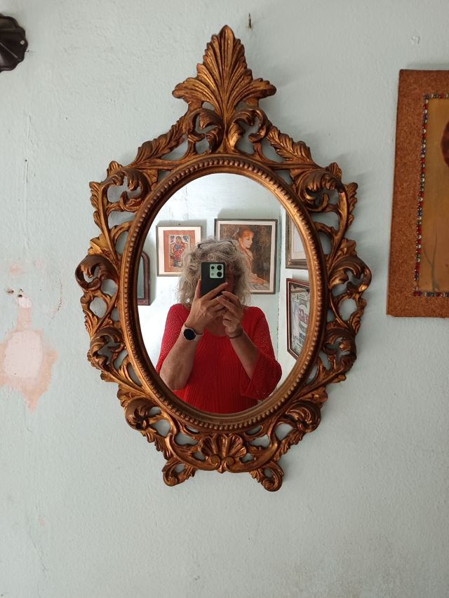 Elegante espejo con marco dorado y detalles ornamentales. - Marco con diseño barroco. - Forma ovalada.