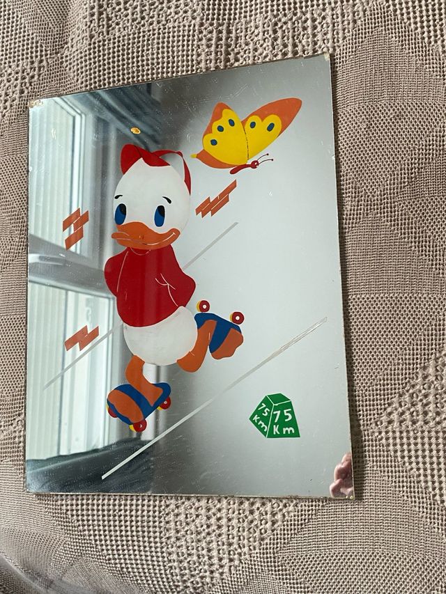 Precioso espejo decorado a mano con un personaje de Disney. - Diseño de pato patoso con patines y mariposa. - Medidas: 33cm de alto x 16cm de ancho.