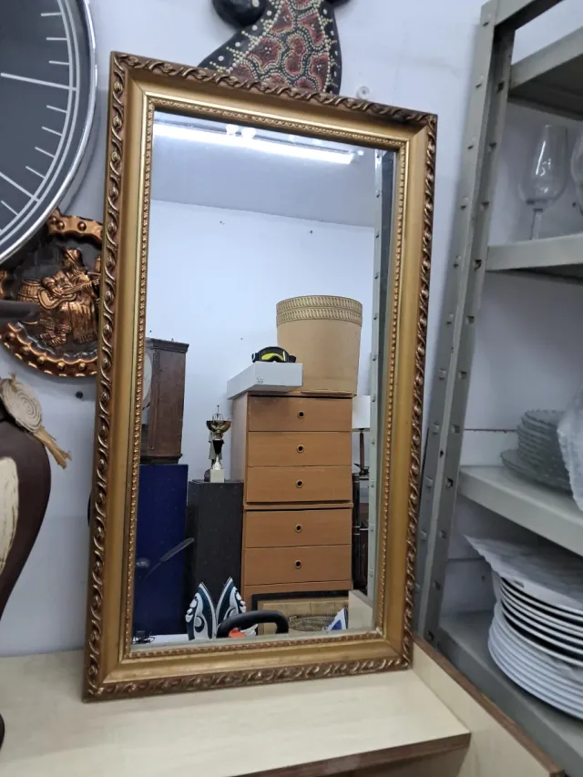 Elegante espejo con un marco dorado y detalles tallados que añaden un toque clásico. - Marco con diseño de grecas y motivos ornamentales. - Color dorado envejecido.