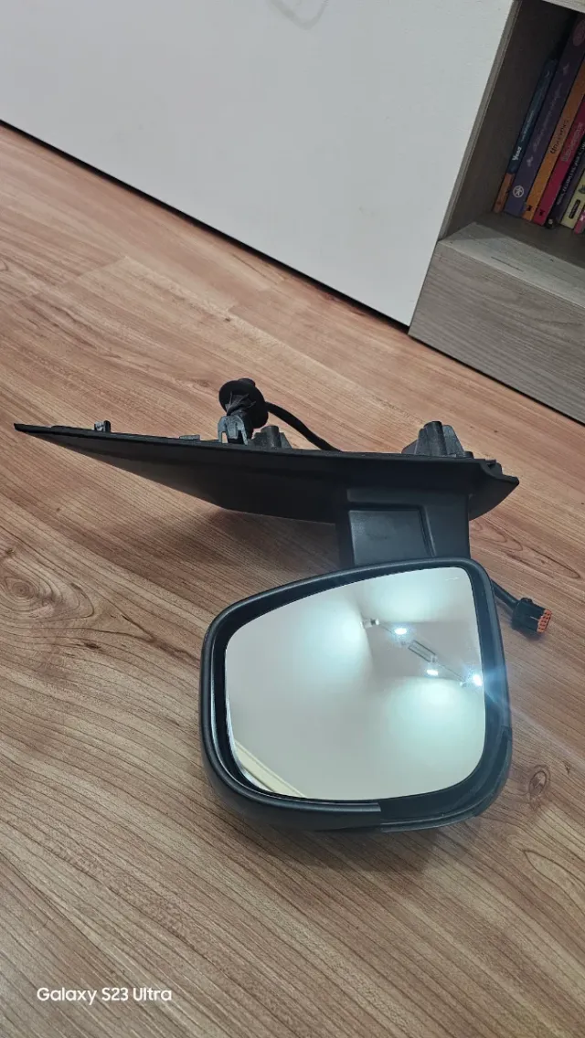 El espejo funciona perfectamente, es termoeléctrico con pliegue manual, la única tara que tiene es el roto del marco.