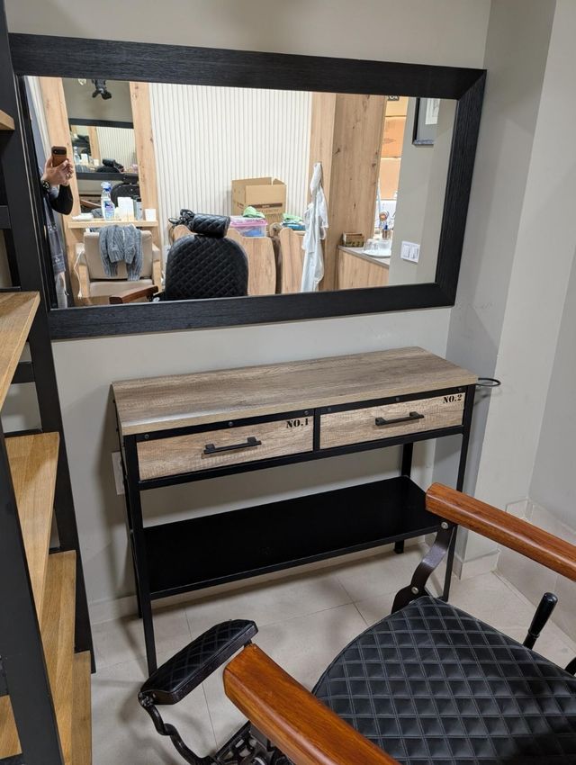 - Tocador con superficie de madera y estructura metálica negra.