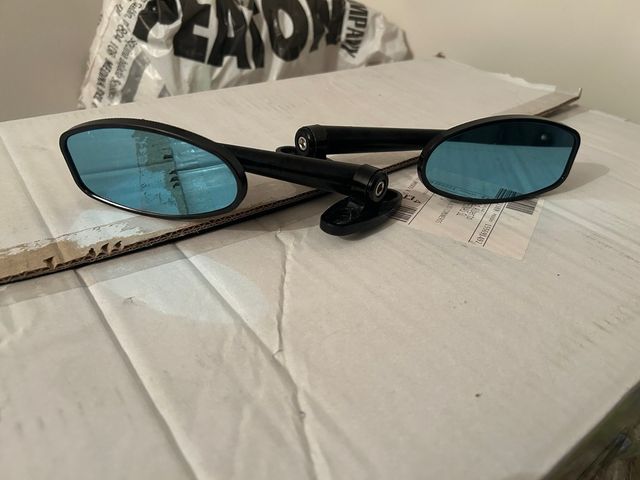 Detalles del productoPar de espejos retrovisores universales con acabado azul.