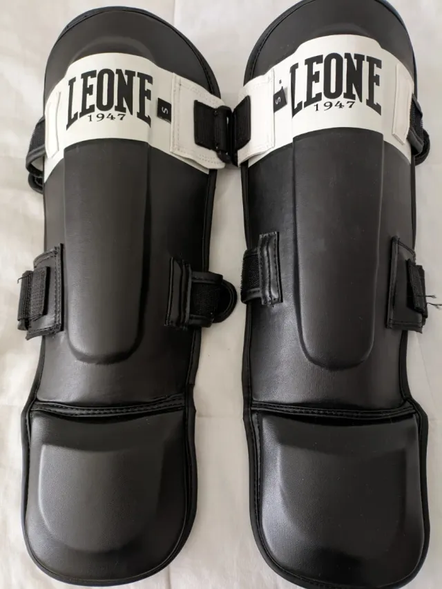 Espinilleras Leone Shock en color negro y talla S. Diseñadas para ofrecer protección. - Cierre con velcro. -kick boxing y Muay Thai. - Logo de Leone 1947.