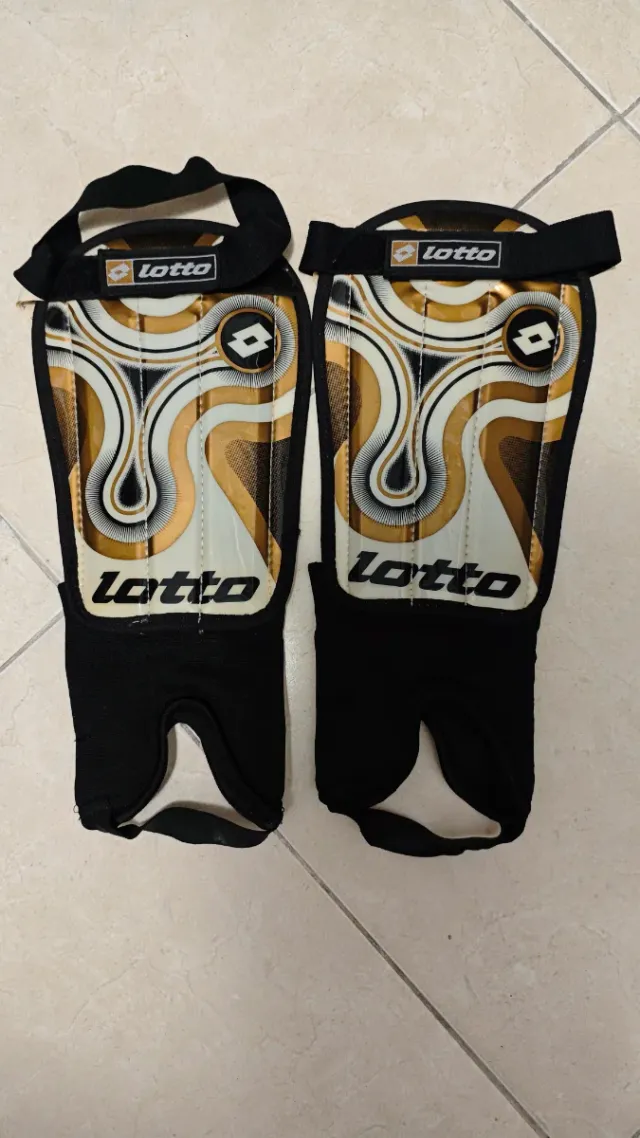 Espinilleras de fútbol de la marca Lotto. - Diseño con detalles en dorado y blanco. - Cierre con cintas. - Material resistente.