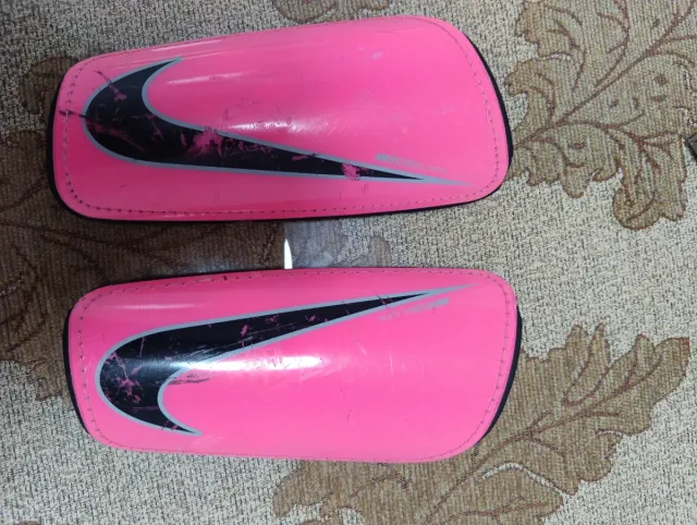 Par de espinilleras Nike Mercurial en color rosa. - Diseño deportivo. - Logo Nike. - Talla M.