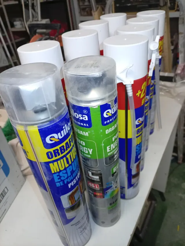 Espuma de poliuretano en spray, ideal para sellar y aislar. - Incluye 8 unidades con cánula. - Incluye 2 unidades con pistola aplicadora.