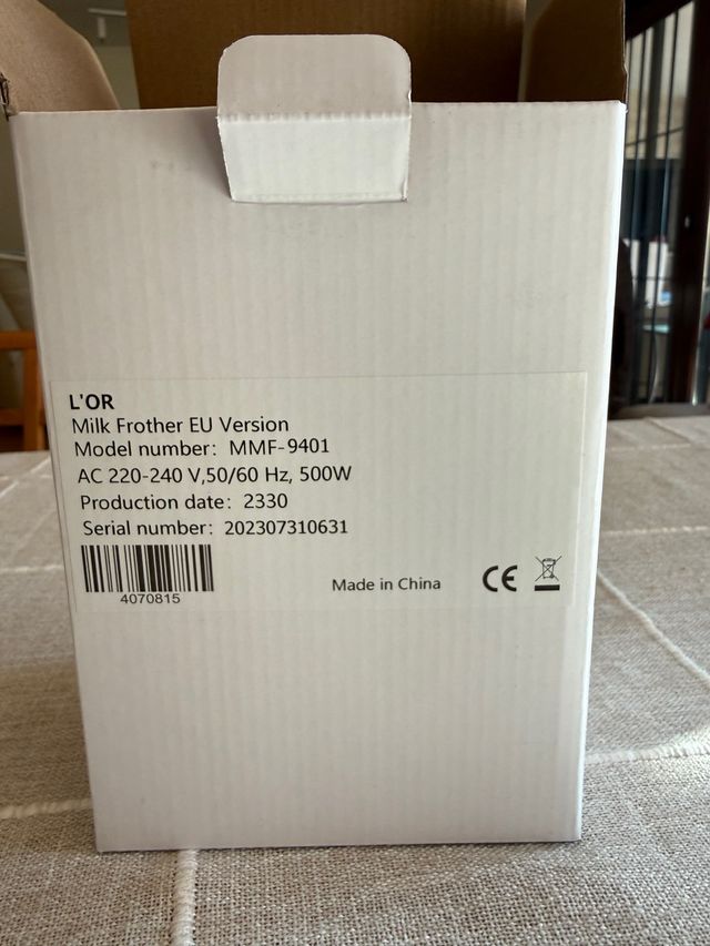 Espumador de leche L'OR, modelo MMF-9401, sin abrir. - Versión EU. - Potencia: 500W. - Voltaje: AC 220-240 V, 50/60 Hz.