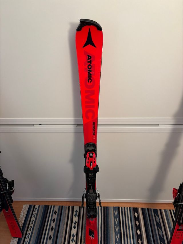 Esquís Atomic Redster 59 SL de 152 cm. - Esquís de slalom. - Color rojo con detalles negros. - Fijaciones incluidas.