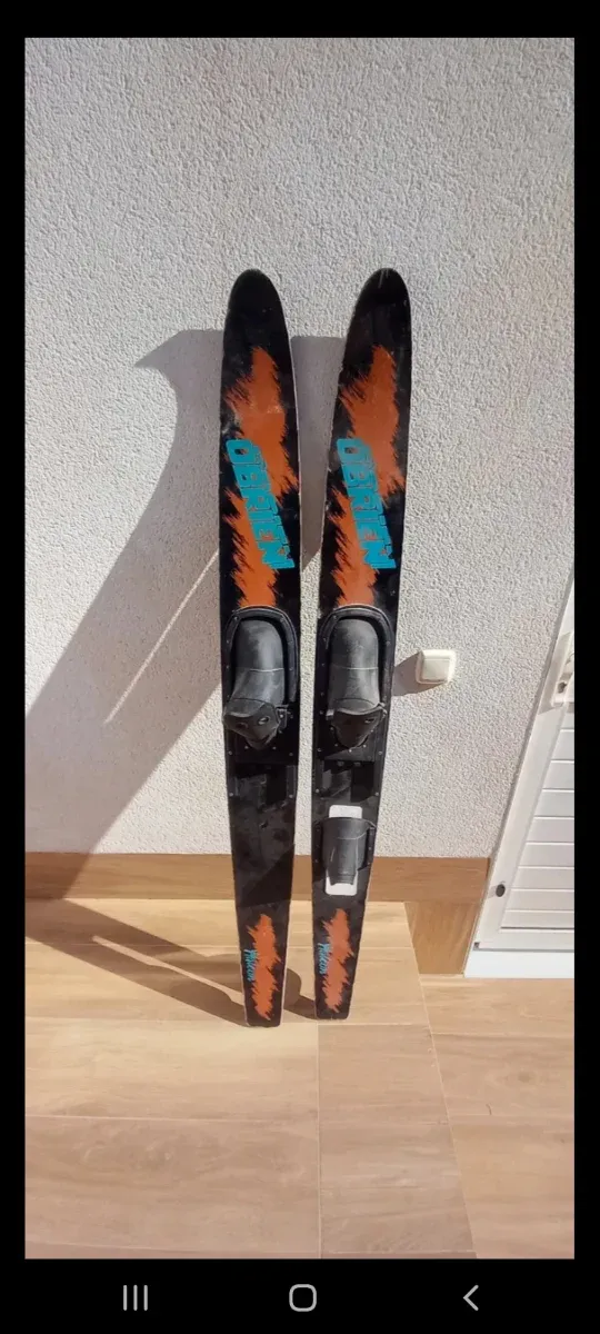 Detalles del productoPar de esquís acuáticos con un diseño llamativo en negro, naranja y azul.