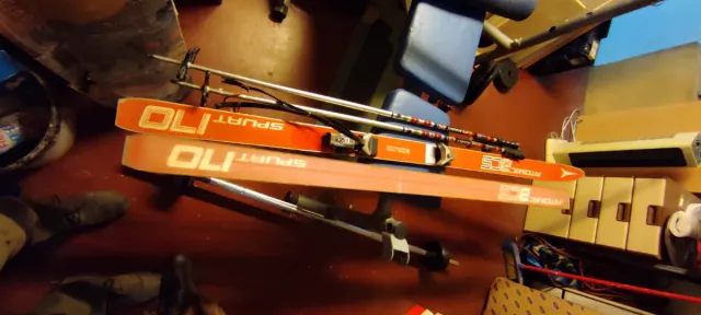 Detalles del productoConjunto de esquís antiguos de la marca Salomón, con una longitud de 170 cm.