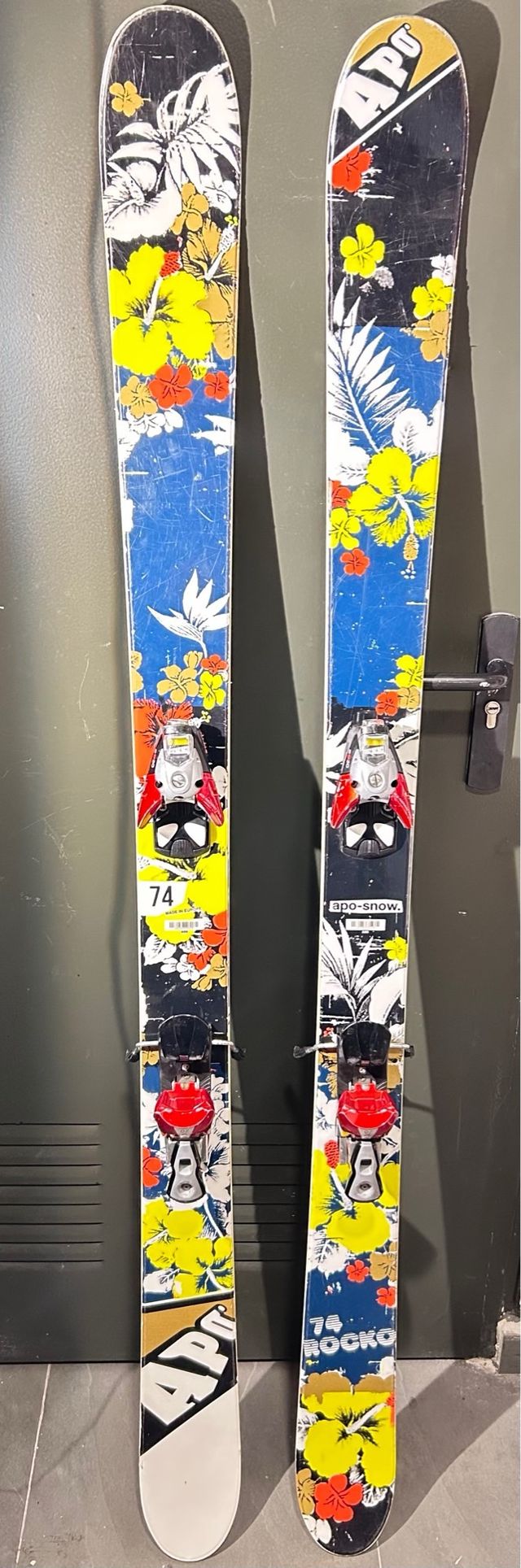 Detalles del productoEsquís APO ROCKO 74, Freeride/Freestyle de 170cm con un patín de 100mm. Presentan un diseño vibrante con motivos florales tropicales en tonos azules, amarillos y rojos sobre un fondo oscuro.