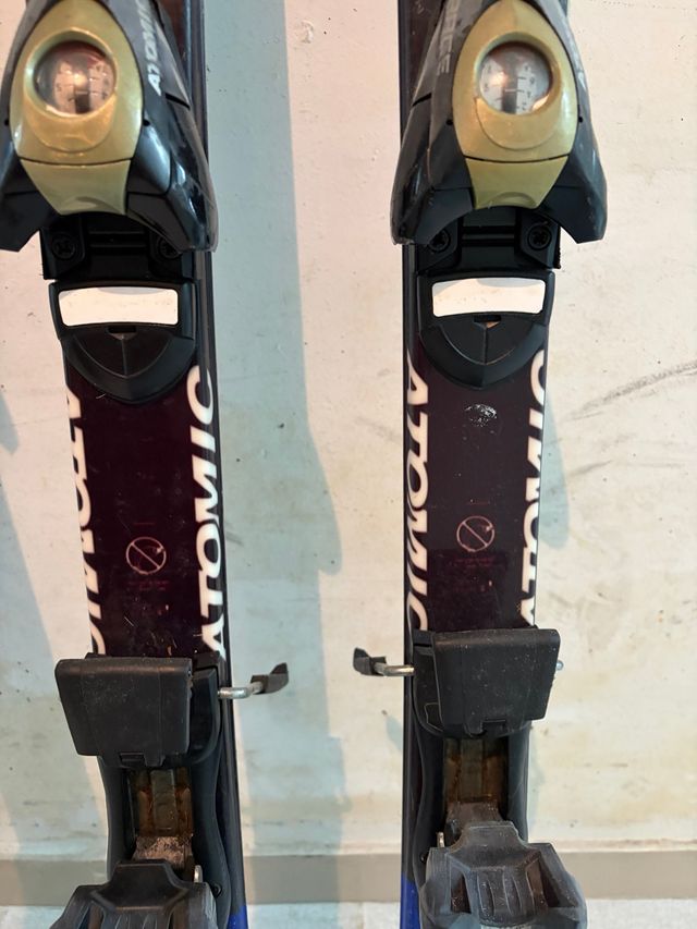 Esquís Atomic de 130 cm de longitud, listos para la nieve. - Fijaciones Atomic incluidas.