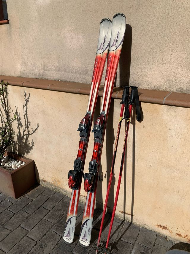 Esquís Atomic Beta Ride 9.2 con fijaciones. - Esquís de pista. - Fijaciones Atomic. - Diseño en blanco, rojo y negro.