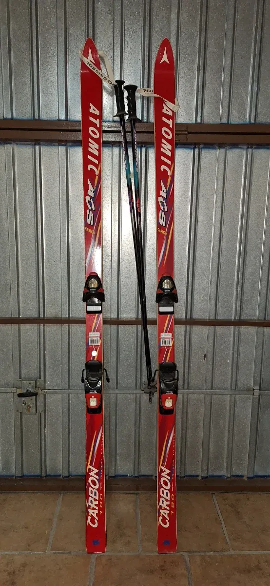Detalles del productoConjunto de esquís antiguos Atomic Carbon con fijaciones Geze y palos Rossignol.