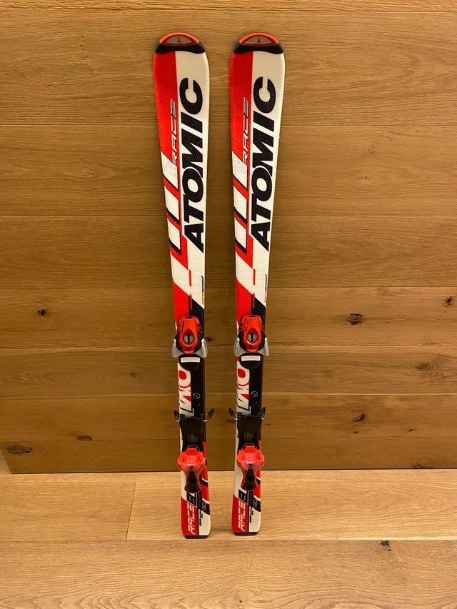 Esquís Atomic modelo Race, diseñados para un rendimiento óptimo. - Diseño en blanco, rojo y negro. - Fijaciones rojas. - Logotipo de Atomic en las botas.