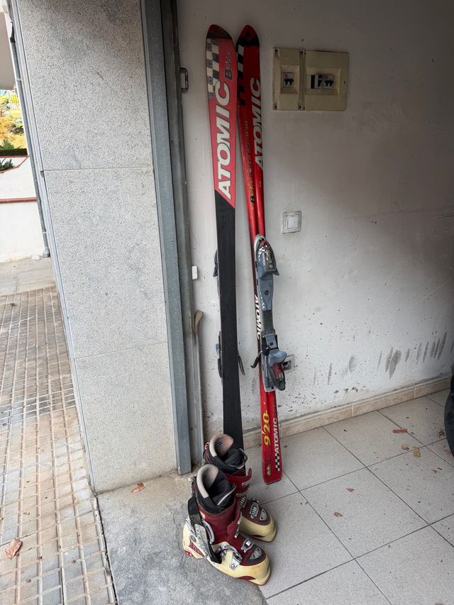 Conjunto de esquís Atomic y botas de esquí. - Esquís Atomic rojos con detalles en negro y blanco. - Botas de esquí rojas y blancas con cierres.