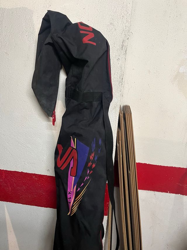 Conjunto de esquís con bolsa de transporte y palos. - Bolsa de esquí negra con diseño. - Palos de esquí