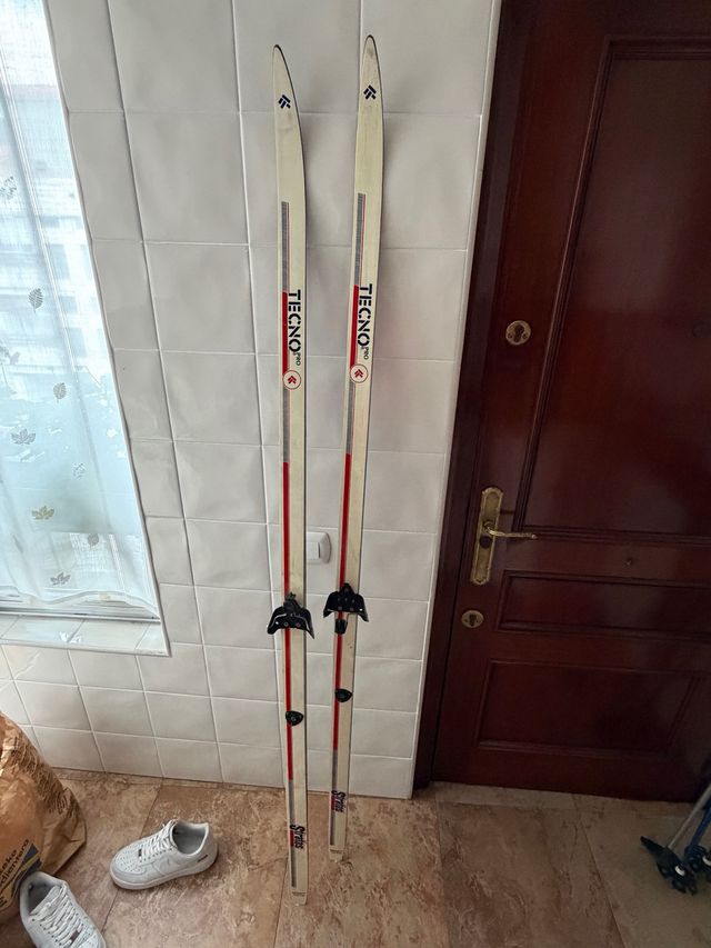 Par de esquís de fondo Tecno Pro. - Diseño clásico en blanco con detalles en rojo. - Fijaciones negras incluidas. - Tengo bastones también de fondo