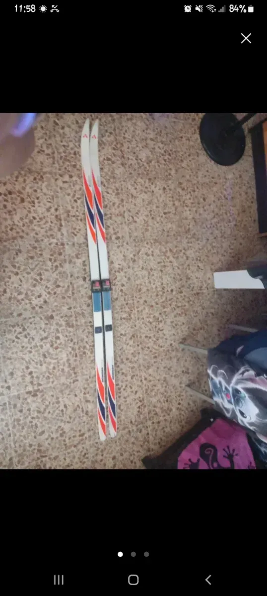 Par de esquís blancos con detalles en rojo y azul. - Diseño con líneas deportivas. - Fijaciones negras y azules.