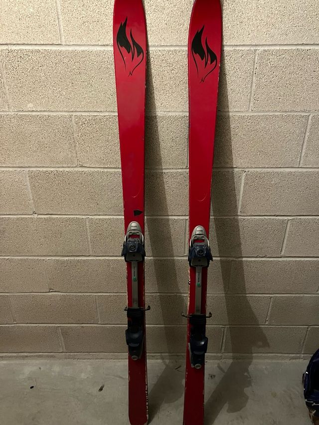 Detalles del productoEsquís de travesía de color rojo con un diseño de llamas negras en la parte superior. Incluyen fijaciones.