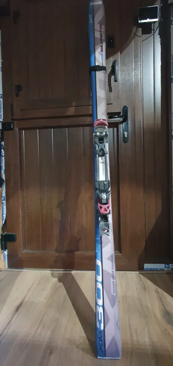 Esquís de travesía con fijaciones Silvretta. - Diseño con detalles en azul y rosa. - Inscripción POWER EDGE CONTROL en el esquí.