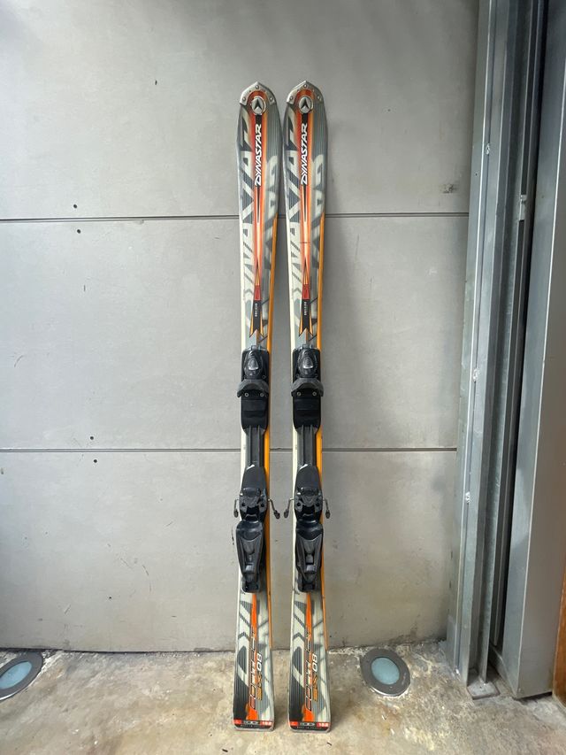Esquís Dynastar Contact 80 con fijaciones. están usados - Diseño deportivo en tonos grises, naranjas y negros. - Fijaciones negras incluidas.