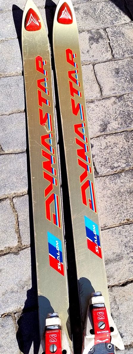 Se trata de unos Dynastar Course SL de 2 m de largo, con fijaciones Salomon originales de la época.