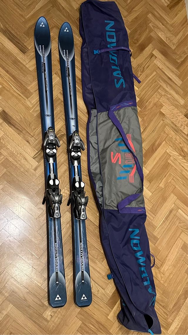 esquis fischer expedition alltrax, medida 173 cm, con fijaciones Salomon, actualmente regulada para bota 42,5 eur. Regalo bolsa porta esquis Salomon.