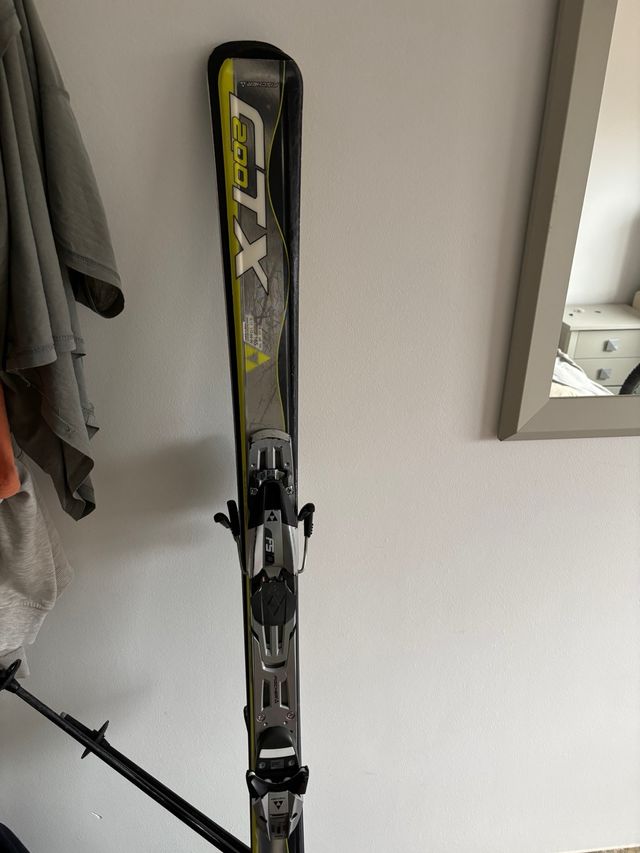 Esquís Fischer CTX 200 con fijaciones. - Esquís de pista. - Diseño deportivo en negro, amarillo y gris.