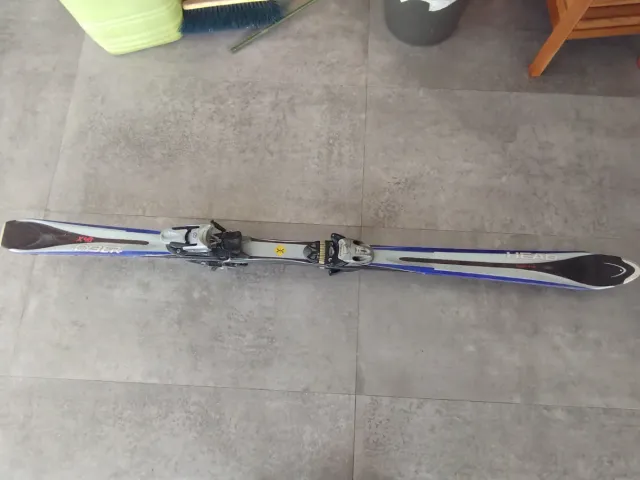 Esquís de la marca HEAD con fijaciones incluidas. Listos para la nieve. - Diseño en blanco, azul y negro. - Fijaciones de esquí montadas.