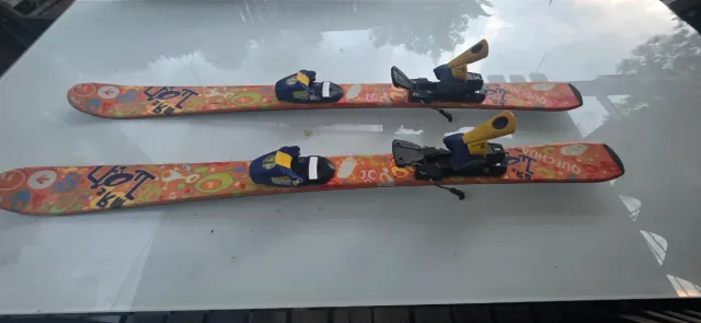 Detalles del productoEsquís infantiles Quechua mRz 100 de 108 cm de largo. El diseño es divertido y colorido, con motivos circulares y el texto QUECHUA en la cola.