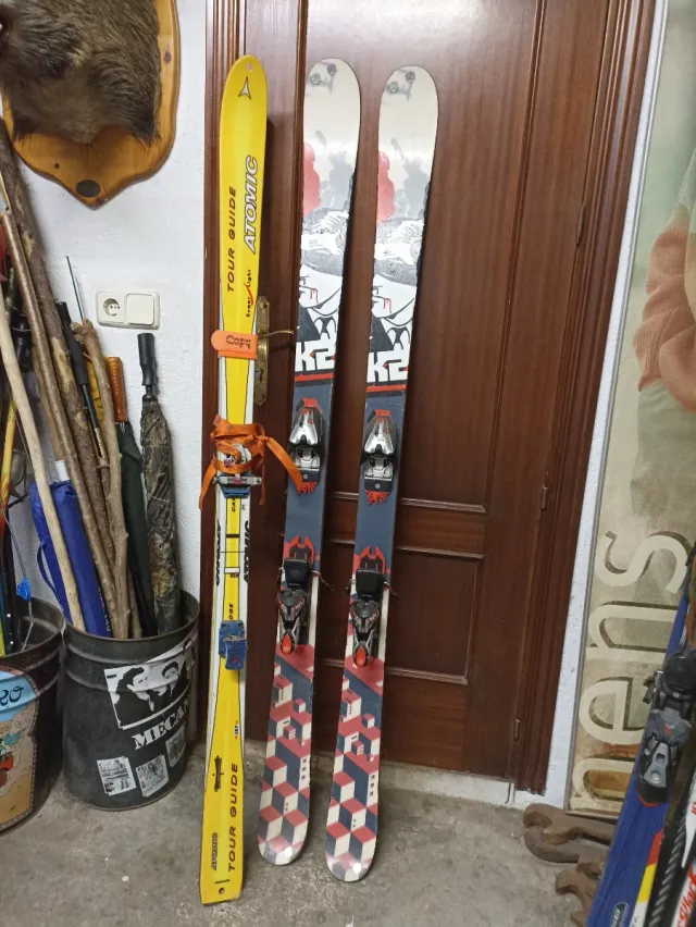Se venden esquís K2 y Atomic Tour Guide. - Esquís K2 con diseño gráfico. - Esquís Atomic Tour Guide amarillos.