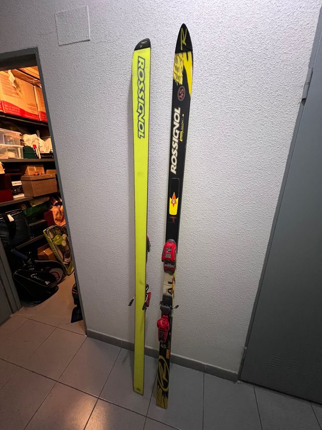 Esquís largos marca Rossignol. Son de los modelos antiguos acabados en pico, para gente que ya sepa esquiar.