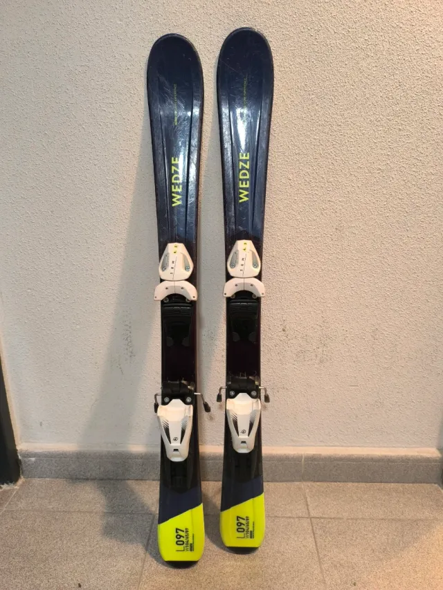 Esquís infantiles de la marca Wedze, ideales para iniciarse en el esquí. - Longitud de 100 cm. - Fijaciones incluidas. - Diseño en azul y amarillo.
