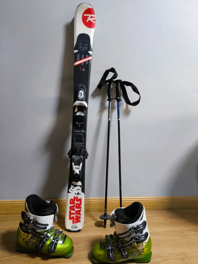 Detalles del productoConjunto de esquí infantil de la marca Rossignol, con esquís de 116 cm y botas talla 33. El diseño incluye personajes de Star Wars.