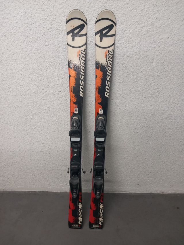 Esquís Rossignol de 130 cm con fijaciones. - Diseño con logo 'R' de Rossignol. - Detalle gráfico naranja y negro. - Fijaciones de esquí incluidas.