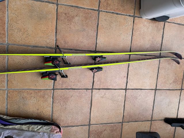 Esquís de la marca Rossignol con fijaciones incluidas. Listos para la nieve. - Esquís de color amarillo y negro. - Fijaciones de la marca Rossignol.