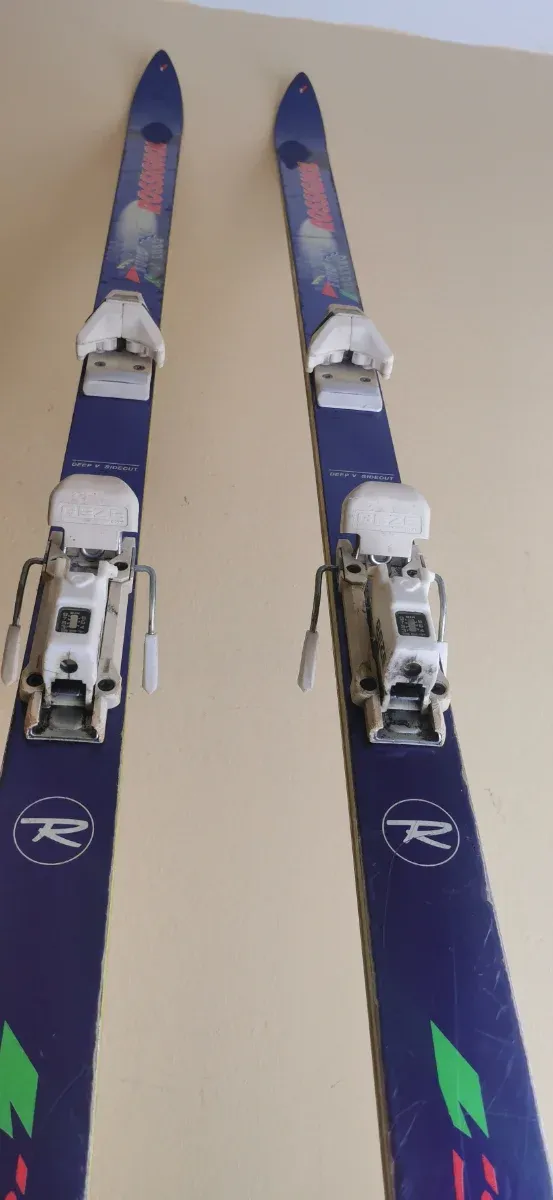 Par de esquís de la marca Rossignol con fijaciones. - Diseño en color azul. - Fijaciones blancas.