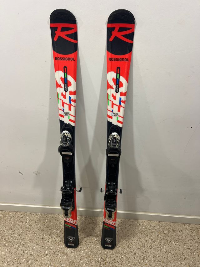 Esquís Rossignol Hero Junior con fijaciones. - Diseño deportivo en rojo, negro y blanco. - Marca Rossignol. - Modelo Hero Junior.