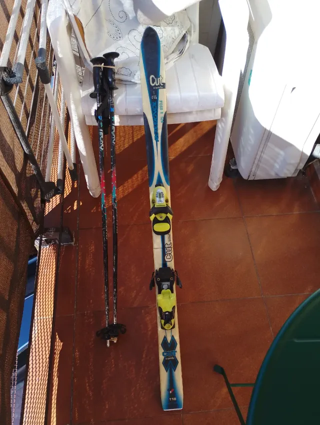 Conjunto de esquís junior de la marca Rossignol, ideal para iniciarse en el deporte. - Esquís con fijaciones. - Bastones de esquí a juego.