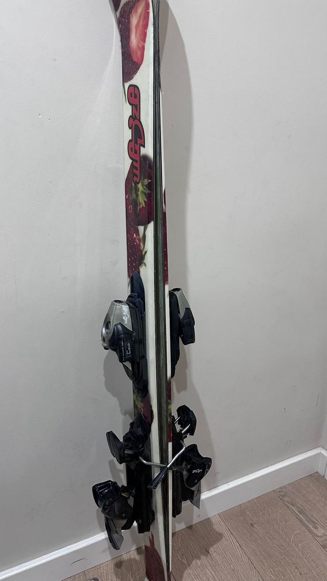 Esquís en perfecto estado, con un diseño único de fresas. Ideales para principiantes y nivel intermedio. - Modelo: Strawberry - Fijaciones incluidas