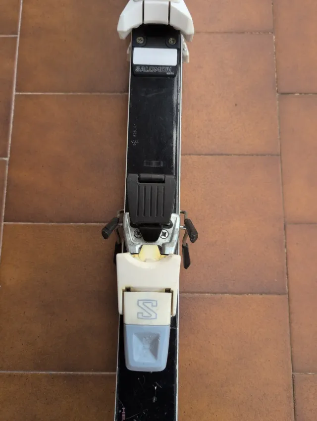 Esquís de la marca Salomon con fijaciones. - Fijaciones Salomon. - Diseño en negro y blanco.