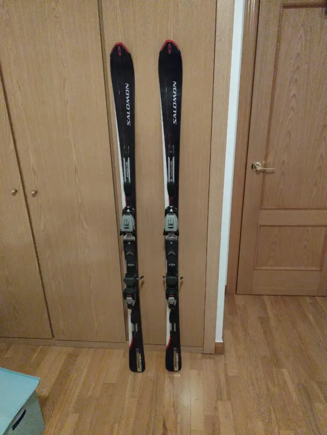 Esquís de la marca Salomon Superaxe Series V3. - Diseño en negro y blanco con detalles rojos. - Fijaciones Salomon incluidas. - Llevan tiempo en el trastero - 168 cm