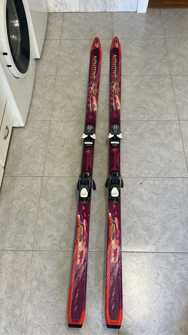 Detalles del productoEsquís alpinos de la marca Salomon con un diseño llamativo en tonos morados y naranjas.