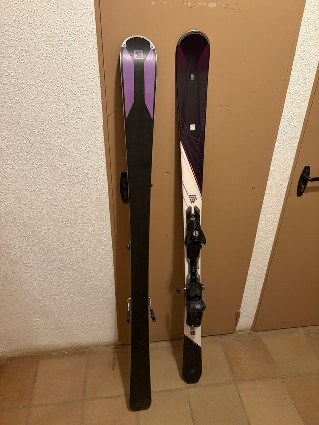 Esquís Salomon para mujer, ideales para disfrutar de la nieve. - Diseño moderno en color negro y morado. - Fijaciones Salomon incluidas.