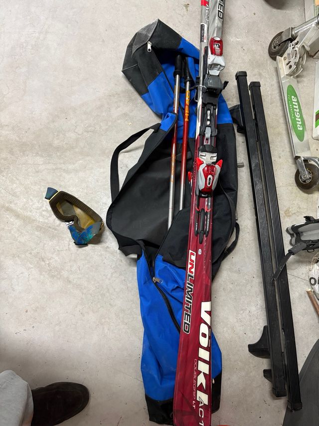 Detalles del productoConjunto de esquís Volkl con bastones y funda para transporte.